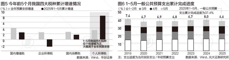 财政部数据显示,今年前5个月,全国一般公共预算支出11.3万亿元,同比增长4.2%。高瑞东分析称,前5个月一般公共预算支出完成度为37.4%,与过去五年平均值较为接近,支出端较为强劲。