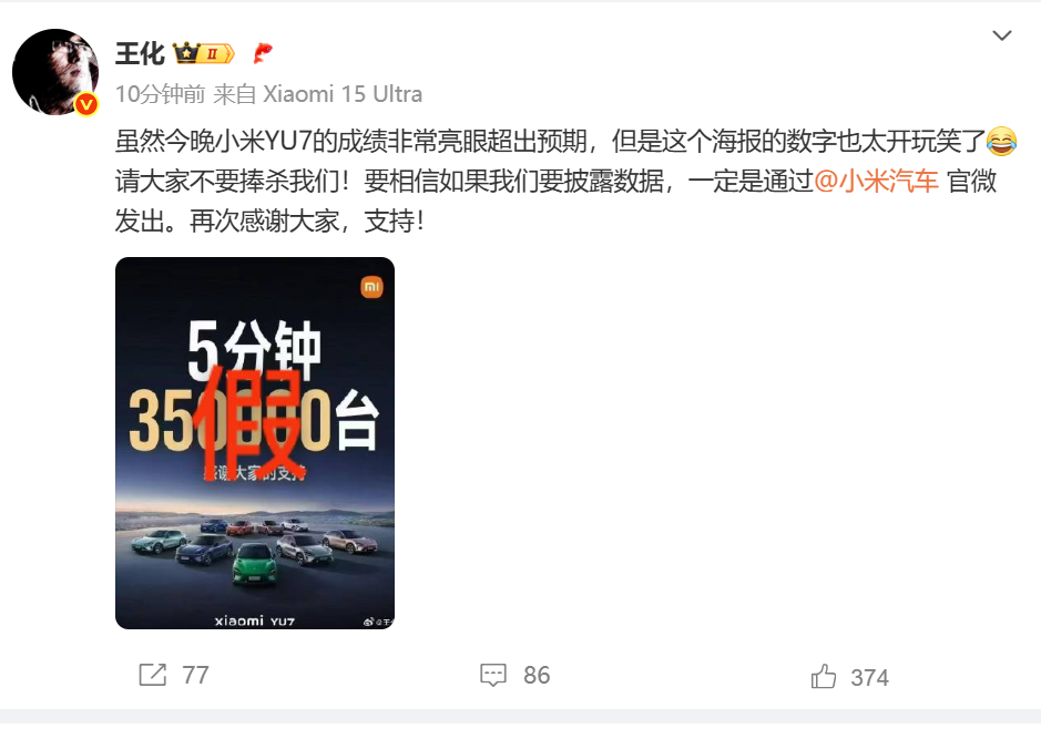 小米集团公关部总经理王化发文对YU7汽车“5分钟大定35万台”这一信息进行辟谣,并表示:虽然今晚小米YU7的成绩非常亮眼超出预期,但是这个海报的数字也太开玩笑了。小米YU7汽车作为小米汽车系列的新品,自发布以来就备受关注,此次大定数据的辟谣也引发了市场的广泛讨论。