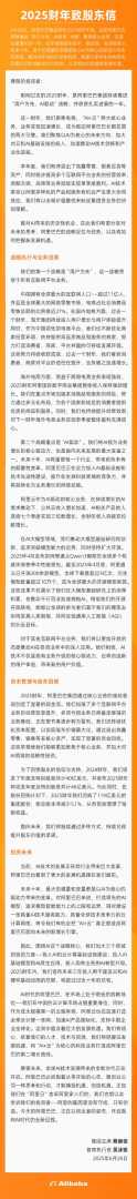 6月26日,阿里巴巴集团发布2025财年年报,同时,阿里巴巴集团董事长蔡崇信、阿里巴巴集团CEO吴泳铭发布《致股东的信》。