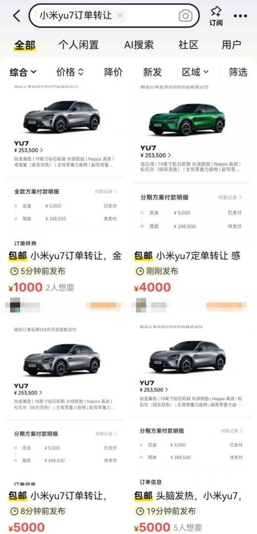 某二手平台中的小米YU7订单转让信息。 网络截图