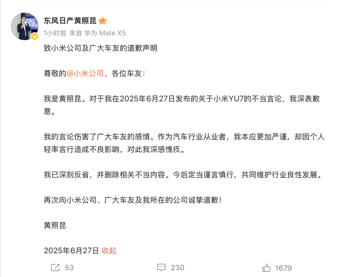 6月27日下午,微博认证为“东风日产新能源黄照昆”的东风日产高管发布道歉声明称,对于其在2025年6月27日(此处应为笔误,实际应为6月27日相关事件但非2025年,但保留原文表述)发布的关于小米YU7的不当言论,深表歉意。“我的言论伤害了广大车友的感情。作为汽车行业从业者,我本应更加严谨,却因个人轻率言行造成不良影响,对此我深感愧疚。”