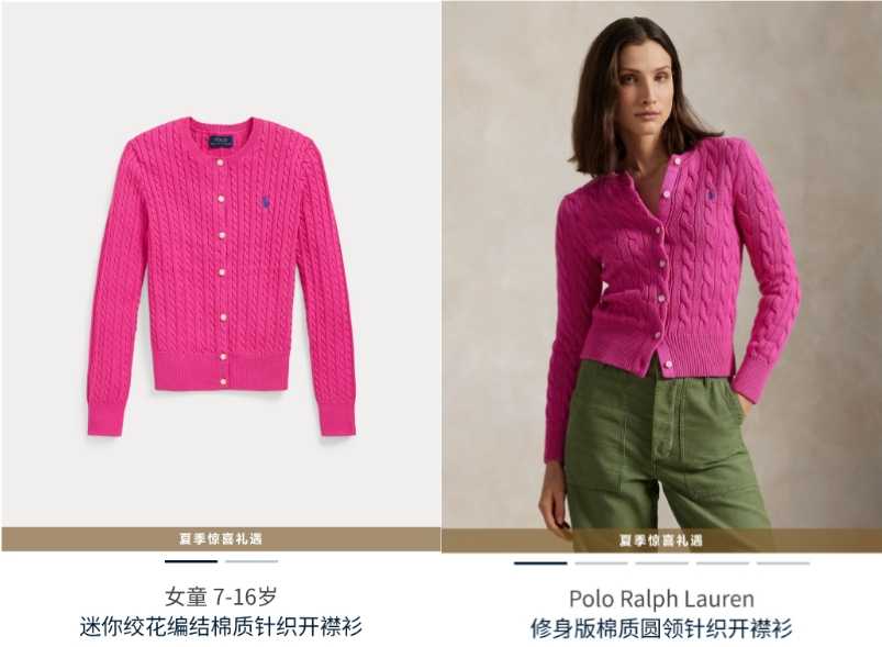 以拉夫劳伦品牌为例,红星资本局浏览其官方线上商城发现,一款玫红色的圆领针织开襟衫,成人款的售价为1393元,童装款的售价为973元,两者相差420元。