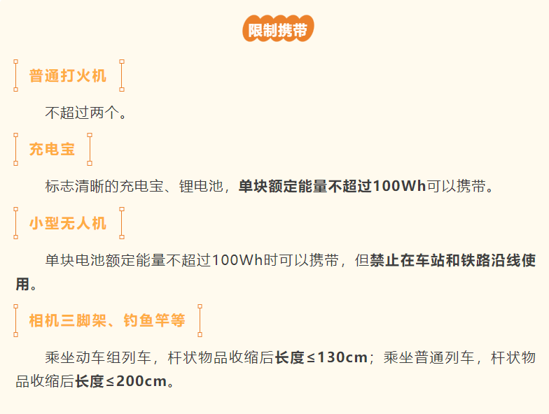 记者接着查询了中国国家铁路集团有限公司官方微信,最近一篇火车携带物品指南系于5月27日发布,限制携带中写明:标志清晰的充电宝、锂电池,单块额定能量不超过100Wh可以携带。