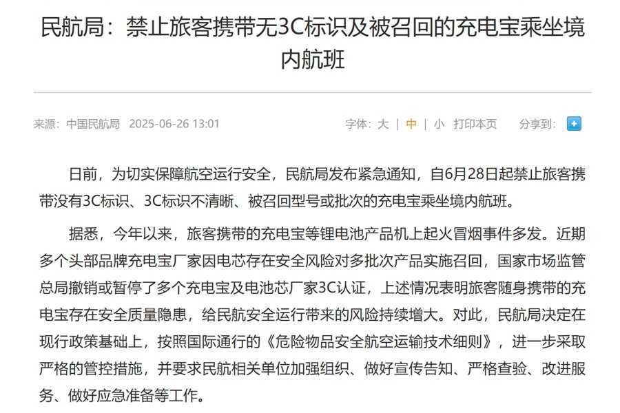 6月27日,“成筐充电宝在机场被拦”的消息成为热点事件。起因是6月26日,民航局紧急发布通知,自6月28日起禁止旅客携带没有3C标识、3C标识不清晰、被召回型号或批次的充电宝乘坐境内航班,而沈阳、深圳、成都等机场已提前执行该政策。