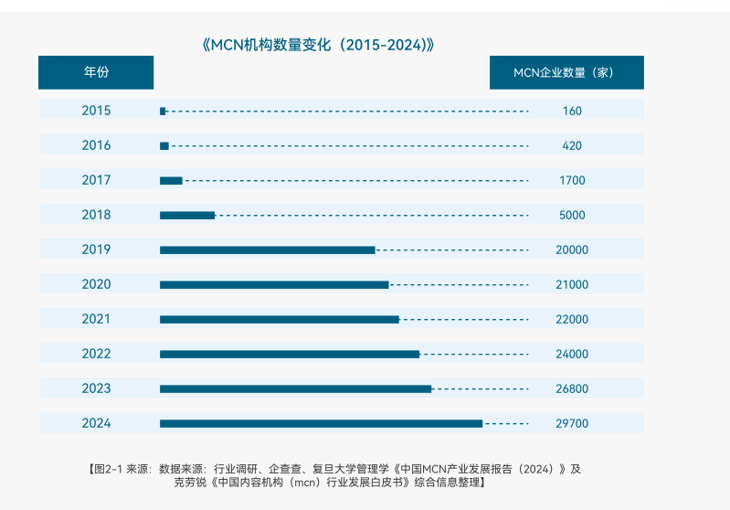 报告显示,截至2025年5月,我国网络表演(直播与短视频)经纪机构(即MCN机构)数量已达2.9万家;MCN行业市场规模达636亿元,预计2025年突破700亿元。过去十年MCN行业经历了高速发展,机构总量从2015年的160家增至2024年的2.9万家,增长超过180倍。