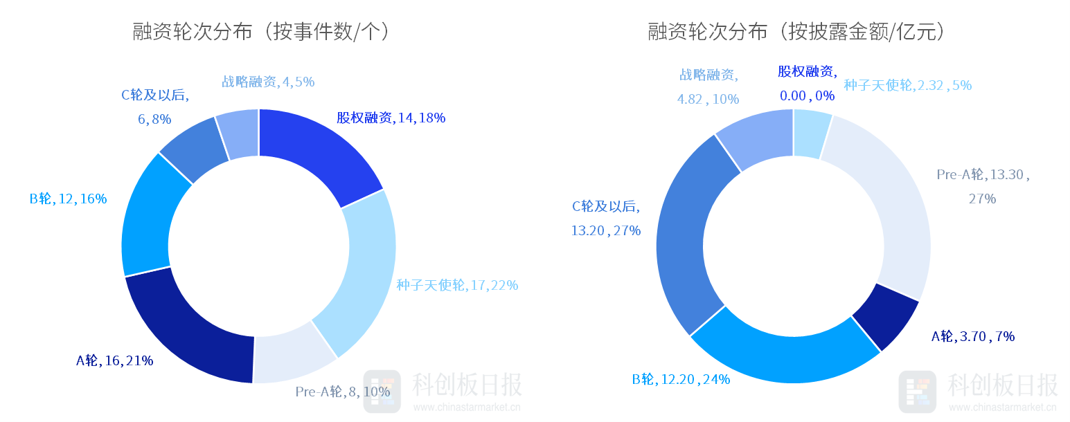 从投资轮次来看,除股权融资外,本周种子天使轮融资事件数最多,发生17起,占比约22%;其次是A轮,发生16起,占比约21%。从各轮次获投金额来看,Pre-A轮披露的融资总额最高,约13.3亿元;其次是C轮及以后,约13.2亿元。