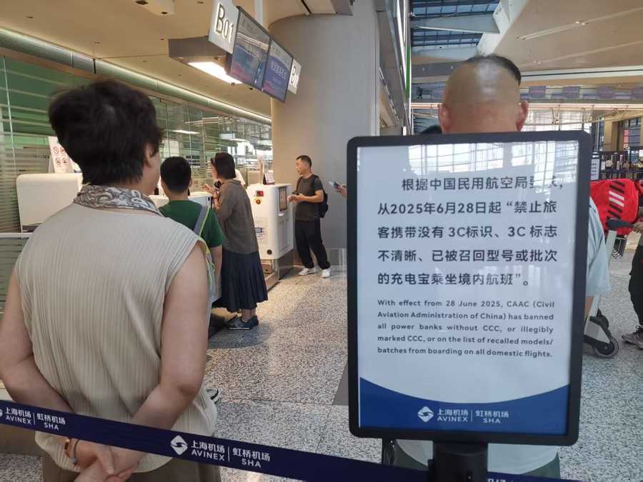 从今天(6月28日)起,根据民航局通知,禁止旅客携带没有3C标识、3C标识不清晰、被召回型号或批次的充电宝乘坐境内航班。上午,新民晚报记者来到上海虹桥机场T2航站楼,实地观察“充电宝新规”执行首日的情况。