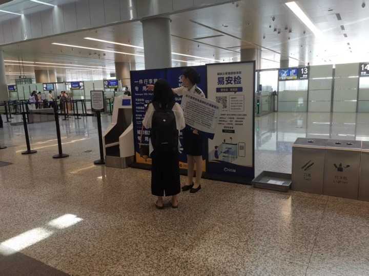 虹桥机场现场工作人员向旅客宣传新规定