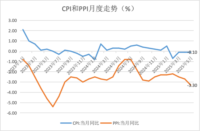 国家统计局数据显示,代表全面物价水平的GDP平减指数连续8个季度为负值,已超过上世纪末的7个季度;5月CPI同比增长为-0.1%,连续27个月同比增速低于1%;5月PPI同比增速为-3.3%,创2023年8月以来的新低,连续32个月同比增速为负。