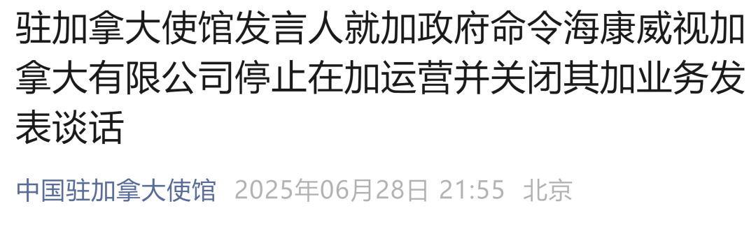 6月27日,加拿大政府以所谓“国家安全”为由,命令海康威视加拿大有限公司停止在加拿大运营并关闭其加拿大业务,此举严重损害中国企业合法正当权益,干扰破坏中加正常经贸合作,中方对此表示强烈不满和坚决反对。经贸合作作为中加关系的重要基石,应得到双方的共同维护。