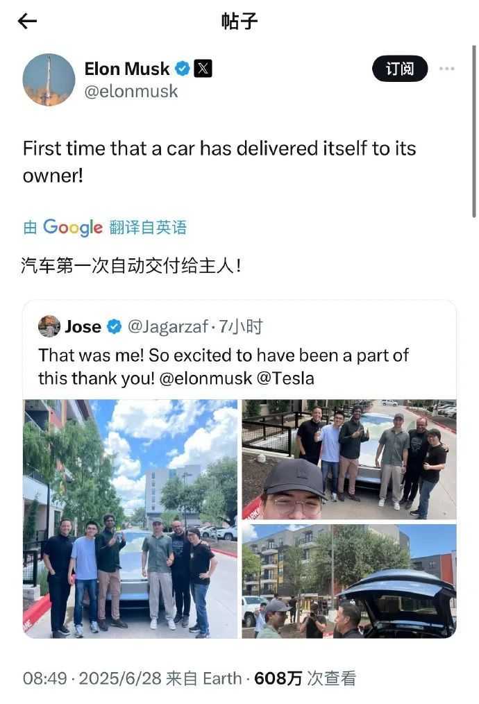 北京时间6月28日凌晨,特斯拉CEO马斯克在社交媒体上表示,“一辆汽车首次自动交付给主人”。根据他的描述,一辆特斯拉Model Y通过自动驾驶,从工厂到城市各处的客户家中完成交付,并比计划提前一天完成。他还赞扬了公司的软件和AI芯片团队。