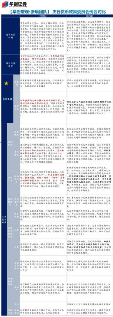 6月27日央行发布2025年二季度货币政策委员会例会通稿,政策基调强调做强国内大循环,货币政策思路灵活,删去“择机降准降息”,增加“灵活把握政策实施力度和节奏”。同时,央行维持“货币政策适度宽松”,并强调畅通货币政策传导机制,提高资金使用效率,防范资金空转,投放流动性方式转变,不止支持商业银行信用扩张,还稳定股债市场流动性。