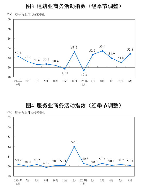 6月份,非制造业商务活动指数为50.5%,比上月上升0.2个百分点。分行业看,建筑业商务活动指数为52.8%,服务业商务活动指数为50.1%。新订单指数为46.6%,投入品价格指数为49.9%,销售价格指数为48.8%,从业人员指数为45.5%,业务活动预期指数为55.6%。