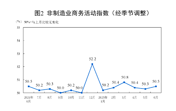 非制造业方面,6月非制造业商务活动指数为50.5%,比上月上升0.2个百分点,非制造业总体继续保持扩张。