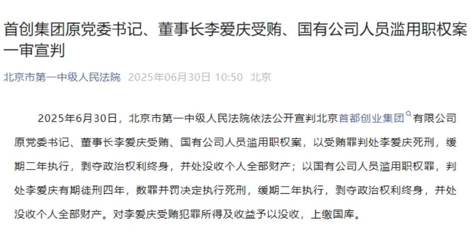 6月30日,北京市第一中级人民法院公开宣判北京首都创业集团有限公司原党委书记、董事长李爱庆受贿、国有公司人员滥用职权案,判处其死刑,缓期二年执行,并处没收个人全部财产。