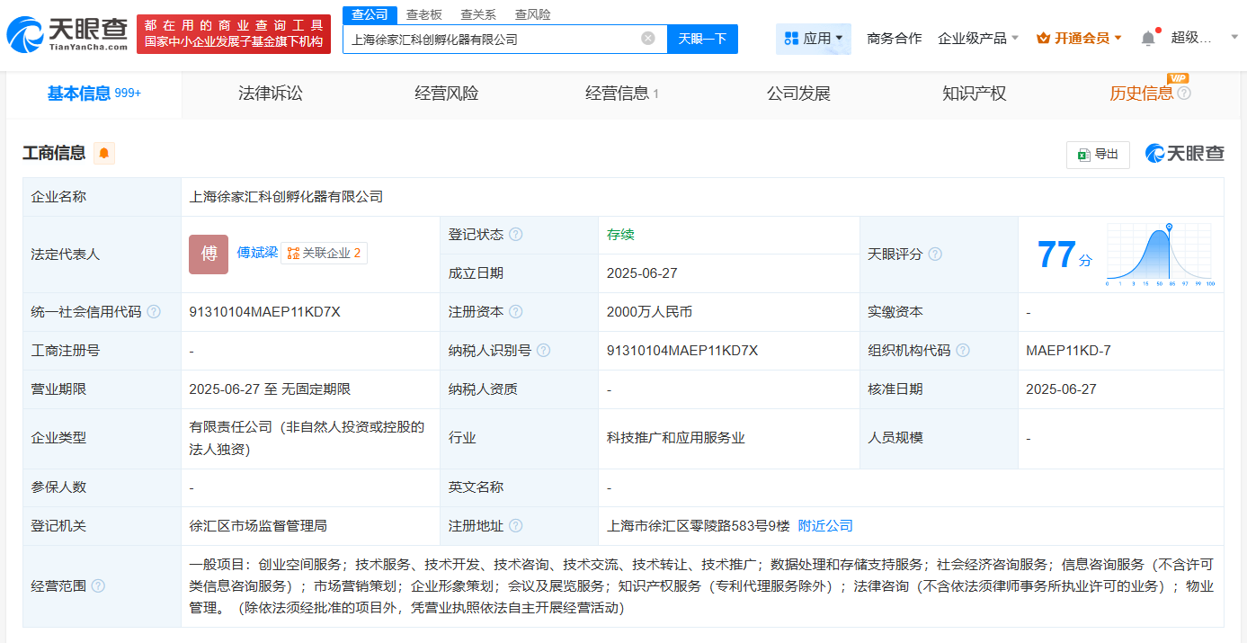 天眼查App显示,上海徐家汇科创孵化器有限公司已成立,法定代表人为傅斌梁,注册资本2000万人民币,经营范围涵盖创业空间服务等多领域,由上海徐家汇商城全资持股。