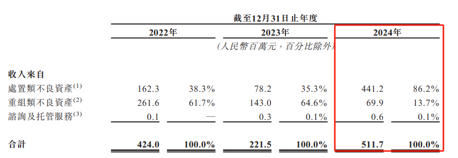 在业绩记录期间,河北资产几乎所有收入均来自不良资产管理业务。2024年,河北资产处置类不良资产的收入达4.412亿元,占比达86.2%;重组类不良资产收入为6990万元,占比13.7%;咨询及托管服务营收仅60万元,占比0.1%。