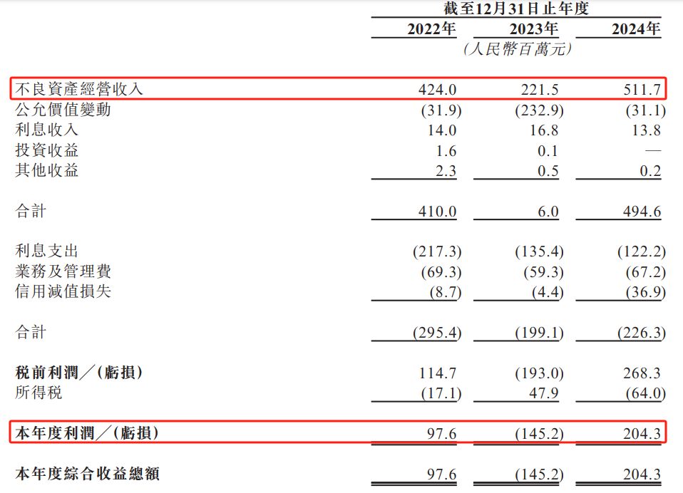 业绩方面,河北资产近几年波动较大。2024年,河北资产的不良资产经营收入同比增长130%,为5.12亿元,并实现利润2.04亿元。不过,在2023年,河北资产的不良资产经营收入仅有2.22亿元,同比下降了48%,并产生-2.33亿的公允价值变动,导致当年最终亏损1.45亿元。