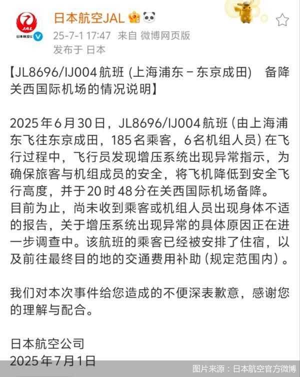 7月1日,日本航空就“上海飞东京航班急降”致歉并说明情况。2025年6月30日,JL8696/IJ004航班因增压系统异常指示备降关西国际机场,乘客已获安排。
