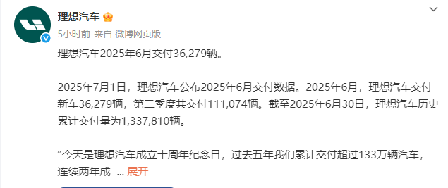 理想汽车发布数据显示,2025年6月,理想汽车交付新车36279辆,第二季度共交付11.1万辆。截至2025年6月30日,理想汽车历史累计交付量为133.8万辆。