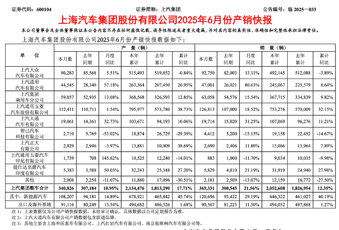上汽集团6月整车销量为36.53万辆,同比增长21.56%。其中,新能源汽车销量12.1万辆,同比增长29.19%;出口及海外基地销量9.06万辆,同比增长11.5%。今年上半年,上汽集团累计销量205.3万辆,同比增长12.4%。