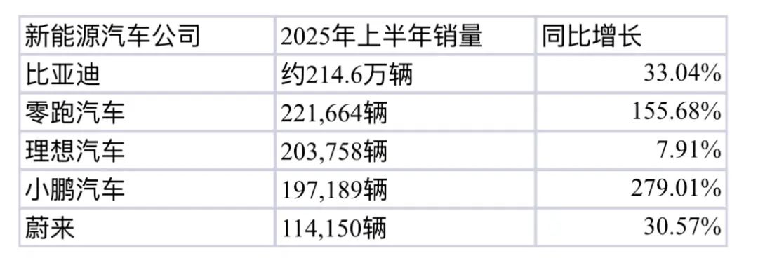 2025上半年新能源汽车销量:比亚迪领跑,零跑蔚小理增长各异.
