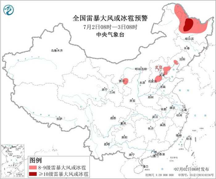 预计7月2日08时至3日08时,东北地区、华北东部等地的部分地区将有8级以上雷暴大风或冰雹天气,其中,黑龙江中西部等地的部分地区将有10级以上雷暴大风,最大风力可达11级以上,黑龙江中西部等地的局地可能出现龙卷天气;东北地区北部和东南部、华北、黄淮北部、西南地区东部、华南南部等地的部分地区将有小时雨量大于20毫米的短时强降水天气,其中,辽宁中西部、山西南部、河北东部、山东北部等地的部分地区小时雨量大于50毫米,最大可达70毫米以上。