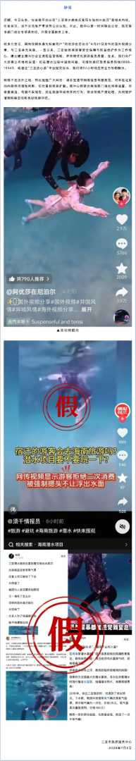 7月2日,三亚市旅游服务中心发布辟谣声明,指出网络流传的“三亚潜水教练反复压女孩向水底沉”视频实为国外视频,与三亚无关,中心已联合多部门展开全面核查。