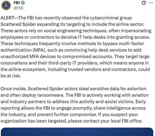 FBI提醒,“分散蜘蛛”针对大型企业以及第三方IT提供商,意味着航空业生态系统中的所有成员,包括承包商,都可能面临风险。