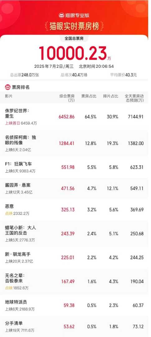 据猫眼专业版数据,7月2日电影市场大盘单日票房破亿,时隔四月再破亿。《侏罗纪世界:重生》领跑票房榜。暑期档总票房已突破20亿元,电影市场复苏势头强劲。