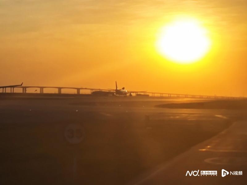 正在香港国际机场等待起飞的民航飞机与远处的港珠澳大桥。