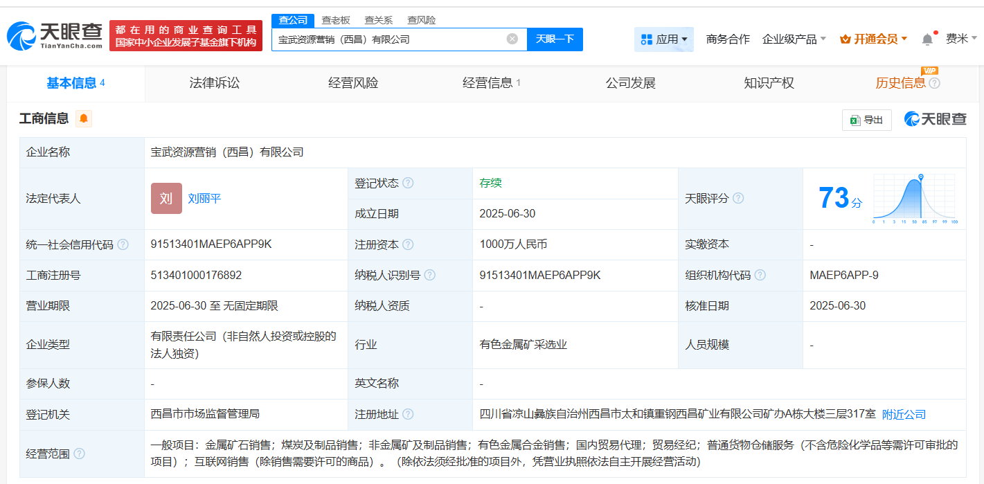 天眼查App显示,近日,宝武资源营销(西昌)有限公司成立,法定代表人为刘丽平,注册资本1000万人民币,经营范围包括金属矿石销售、煤炭及制品销售、非金属矿及制品销售、国内贸易代理、贸易经纪、普通货物仓储服务等。这一新公司的成立,标志着宝武资源在金属矿石及非金属矿销售领域进一步拓展,有望推动相关产业链的发展。股权全景穿透图显示,该公司由宝武资源有限公司全资持股,后者为中国宝武钢铁集团有限公司的全资子公司。
