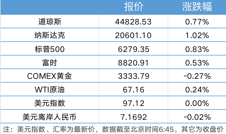 1、美国三大股指收盘涨跌不一,标普500指数涨0.83%,纳指涨1.02%,道指收涨0.77%。标普500指数创下年内第七次历史收盘新高。