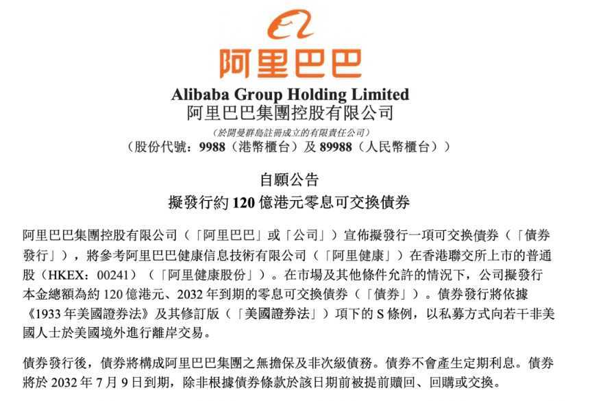 7月3日,阿里巴巴集团发布公告称,计划发行本金总额约120亿港元、2032年到期的零息可交换债券。