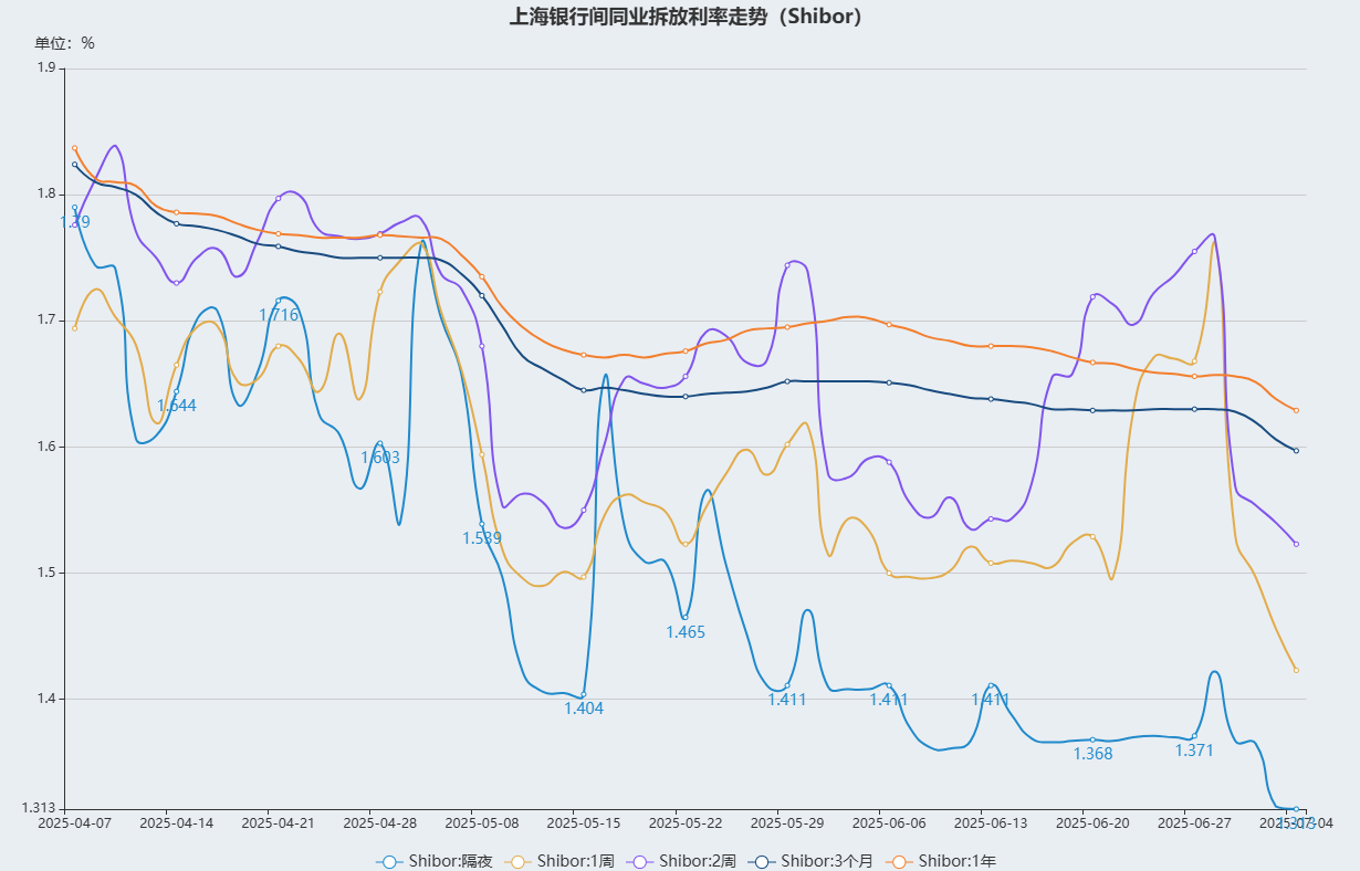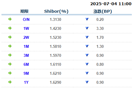 上海银行间同业拆放利率(Shibor)各品种连续下跌。具体来看,隔夜Shibor下跌0.20BP,报1.3130%;7天Shibor下跌3.30BP,报1.4230%;14天Shibor下跌1.70BP,报1.5230%。