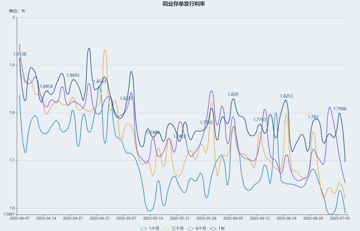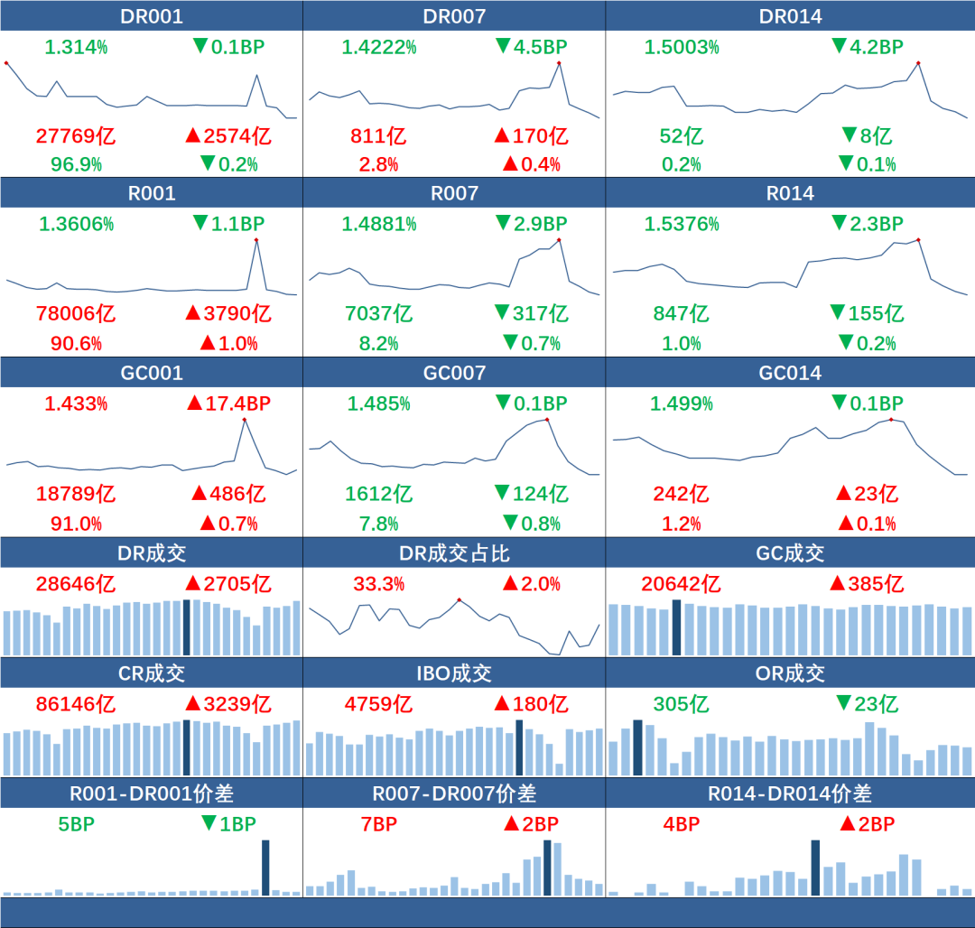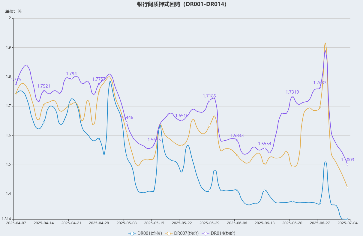 银行间质押式回购市场方面,利率跌幅有所放缓,隔夜品种成交小幅上调。具体看,DR001、R001加权平均利率分别下行0.1BP、1.1BP,报1.314%、1.3606%,成交额分别增加2547亿元、3790亿元;DR007、R007加权平均利率分别下行4.5BP、2.9BP,报1.4222%、1.4881%,成交额分别增加170亿元、减少317亿元;DR014、R014加权平均利率分别下行4.2BP、2.3BP,报1.5003%、1.5376%,成交额分别减少8亿元、155亿元。