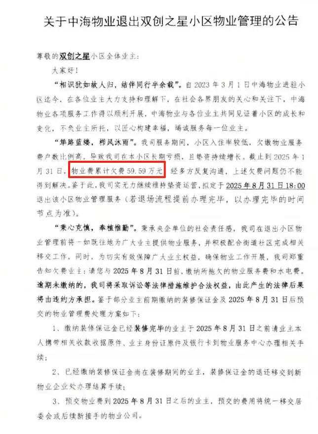 6月25日,中海物业向鄂州双创之星小区发出撤场公告信,表示公司将于2025年8月31日18:00正式退出项目,结束服务。导火索则是自2023年3月1日迄今,小区入住率较低,累计欠物业费59.59万元,项目长期亏损,公司无力继续维持垫资运营。