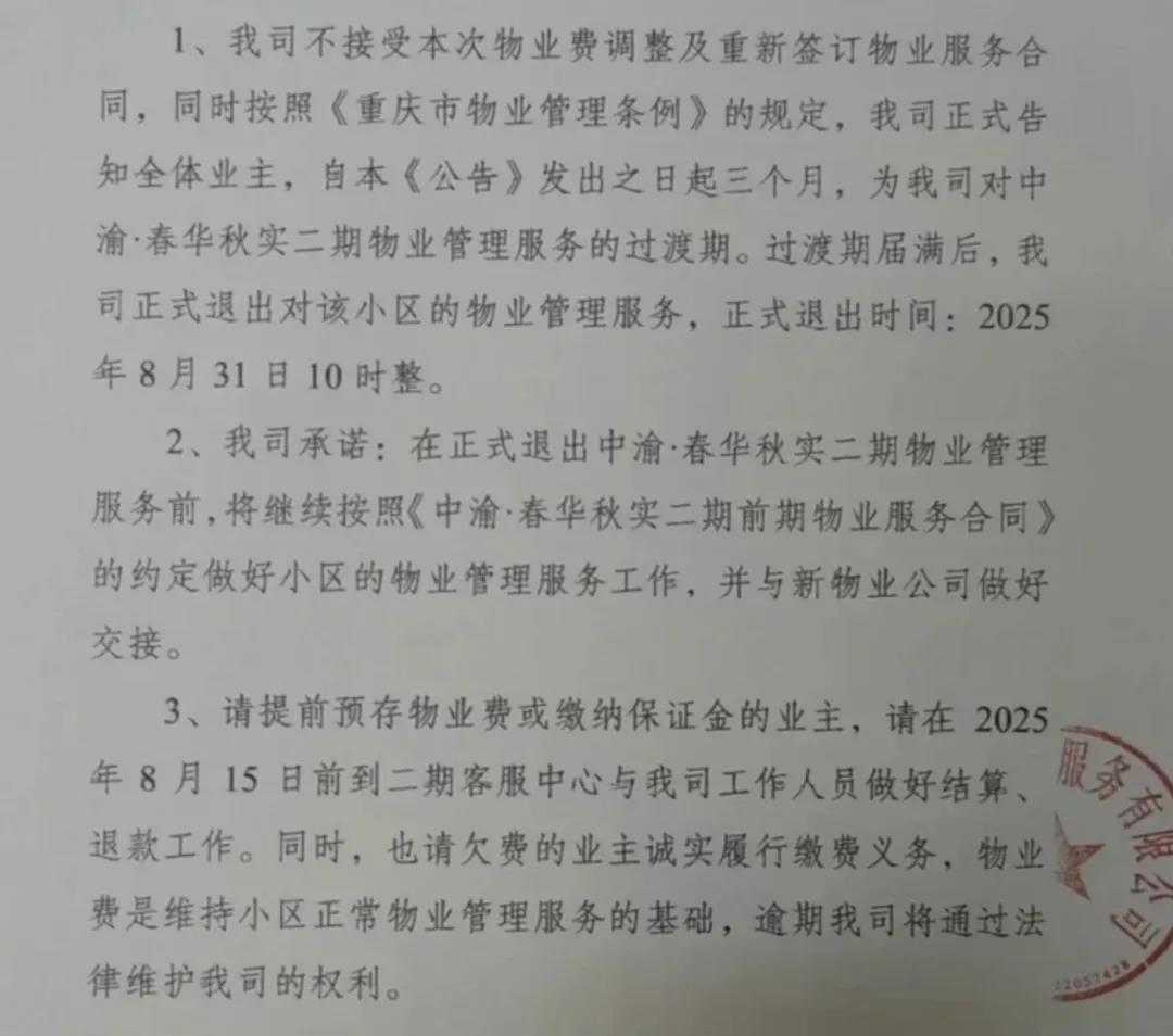 此前金科服务也曾发布类似公告,宣布将于2025年8月31日正式退出重庆龙兴未来城市小区,理由也是运营近6年长期亏损,无奈撤场。