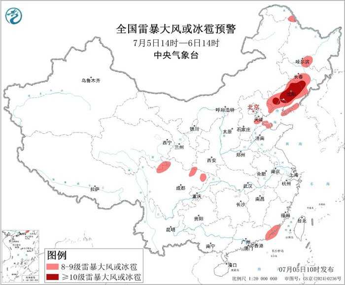 中央气象台7月5日10时继续发布强对流天气蓝色预警,预计东北、西南等地部分地区将有8级以上雷暴大风或冰雹,以及小时雨量大于20毫米的短时强降水,提醒相关部门和公众做好防范。