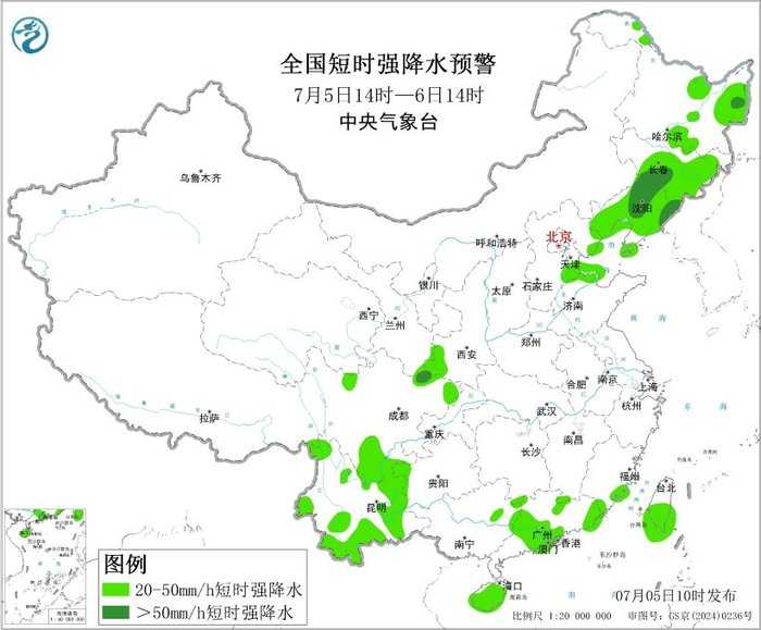 中央气象台7月5日10时继续发布强对流天气蓝色预警:预计7月5日14时至6日14时,东北地区中南部、西南地区北部等地的部分地区将有8级以上雷暴大风或冰雹天气,其中,吉林南部、辽宁中部等地的部分地区将有10级以上雷暴大风,最大风力可达11级以上;东北地区、华北地区东北部、西南地区南部、华南东部等地的部分地区将有小时雨量大于20毫米的短时强降水天气,其中,黑龙江东北部、吉林中部、辽宁中东部等地的部分地区小时雨量大于50毫米,最大可达70毫米以上。