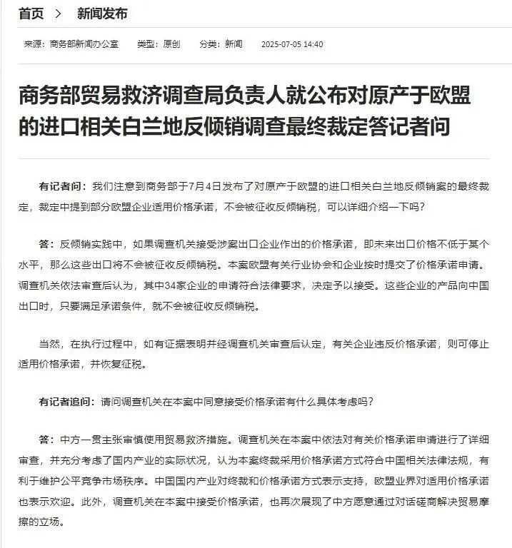 有记者问:我们注意到商务部于7月4日发布了对原产于欧盟的进口相关白兰地反倾销案的最终裁定,裁定中提到部分欧盟企业适用价格承诺,不会被征收反倾销税,可以详细介绍一下吗?