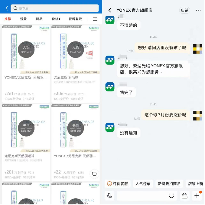 目前尤尼克斯天猫旗舰店和京东自营专区内,所有天然羽球产品均显示售罄,客服回应称暂未接到涨价通知。有球馆老板透露,他们从6月份开始就没有订到羽毛球了。