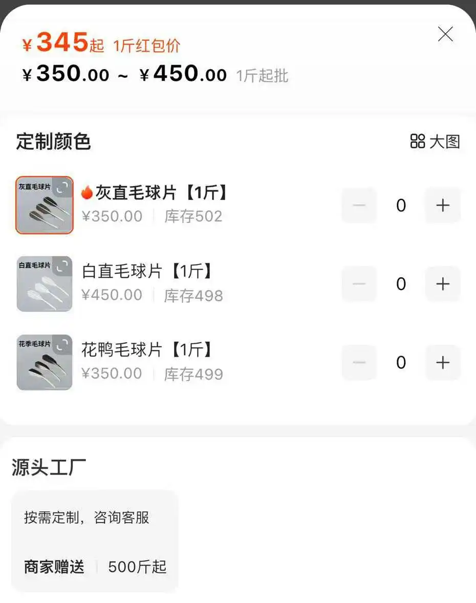 来自产业链上游的消息验证了这一推测。有毛片商向蓝鲸记者透露,近期毛片并无显著大涨,一些中低档的羽毛反倒掉价了。