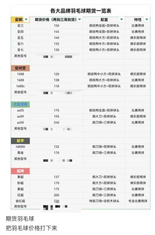 经营“期货羽毛球”生意的某位商家表示,目前尤尼克斯全线和亚狮龙的部分型号暂不接受“预定”。因为尤尼克斯这次涨价幅度可能很高,没有办法按照表格上的锁单价格接受预定。这种“预付款+延后发货”的模式与经销商向上游订货类似,总体是一种抵御涨价的被动手段,对整体价格体系的影响非常有限。