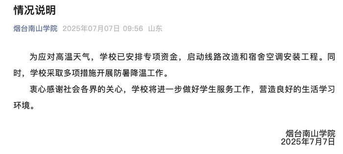 烟台南山学院7月7日发布情况说明称,为应对高温天气,学校已安排专项资金,启动线路改造和宿舍空调安装工程,以改善学生住宿环境。同时,学校采取多项措施开展防暑降温工作,确保学生健康。