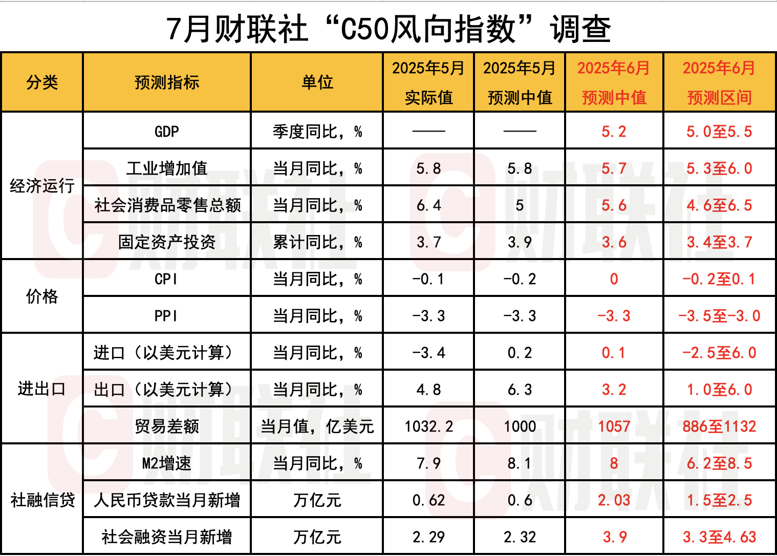 “C50风向指数调查”由财联社发起,近20家机构参与,全面反映市场机构对宏观经济、货币政策及金融数据的预期。