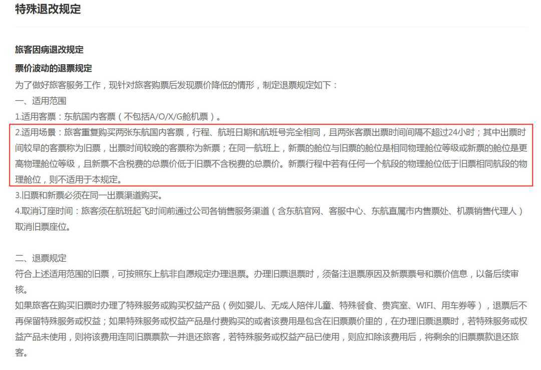 适用范围包括:东航国内客票(不包括A/O/X/G舱机票);旅客重复购买两张东航国内客票,行程、航班日期和航班号完全相同,且两张客票出票时间间隔不超过24小时;其中出票时间较早的客票称为旧票,出票时间较晚的客票称为新票;在同一航班上,新票的舱位与旧票的舱位是相同物理舱位等级或新票的舱位是更高物理舱位等级,且新票不含税费的总票价低于旧票不含税费的总票价;新票行程中若有任何一个航段的物理舱位低于旧票相同航段的物理舱位,则不适用于本规定;旧票和新票必须在同一出票渠道购买;旅客须在航班起飞时间前通过公司各销售服务渠道(含东航官网、客服中心、东航直属市内售票处、机票销售代理人)取消旧票座位。