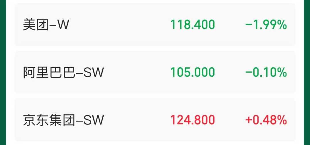 外卖平台股价则表现平平,美团(03690.HK)、阿里巴巴(09988.HK)、京东集团(09618.HK)股价一度齐跌。截至发稿,美团跌1.99%,阿里巴巴跌0.10%,京东集团涨0.48%。