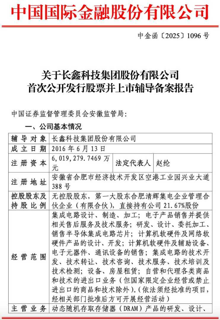 7月7日,证监会官网显示,国产DRAM内存芯片大厂长鑫科技集团股份有限公司(以下简称长鑫存储)启动首次上市辅导,中金公司、中信建投担任辅导机构。