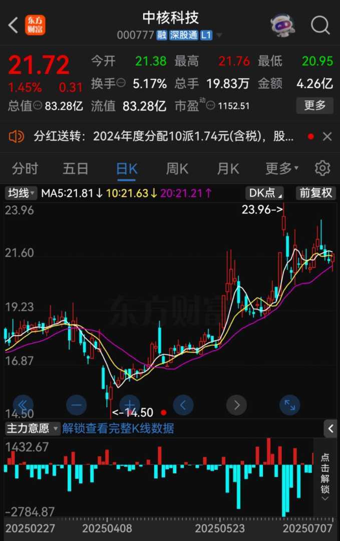 截至7月7日收盘,中核科技股价报21.72元/股,总市值为83.28亿元。